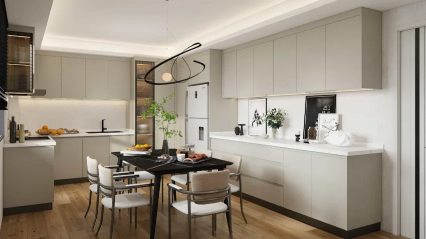Gabinetes de cocina color crema en forma de U de melamina Inspírate en la serena paleta de la naturaleza, combinando el tono atemporal de la niebla matutina con la funcionalidad de una envolvente forma de U. Diseñados para brindar durabilidad y elegancia, estos gabinetes se combinan sin esfuerzo con diversos estilos de interiores, brindando un aura cálida y espaciosa que enciende la creatividad culinaria en cualquier cocina moderna.