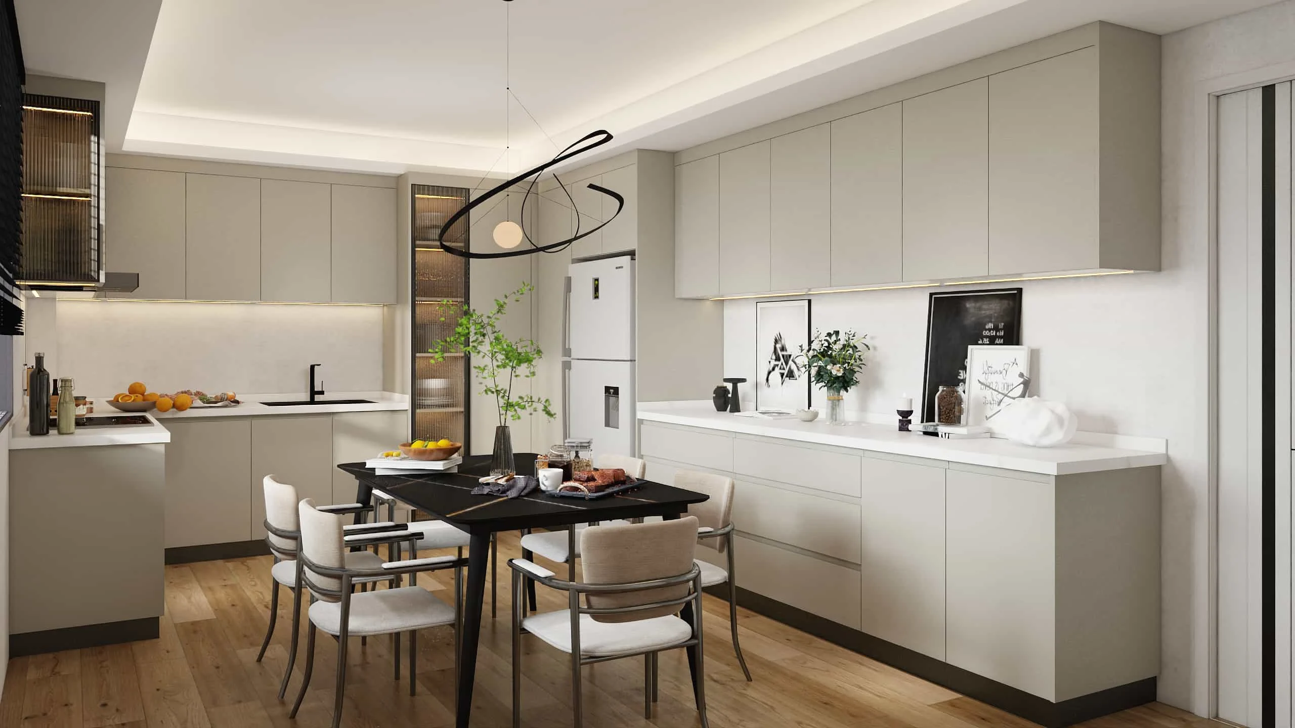Concepto de diseño: Este moderno diseño de gabinete de cocina tiene un color gris minimalista moderno, una combinación de colores clásica y estable; El espacio general del gabinete moderno está claramente estratificado, el marco de metal abierto y los gabinetes de melamina de alta gama se combinan razonablemente para eliminar la depresión y aportar un toque de ligereza y agilidad al espacio.