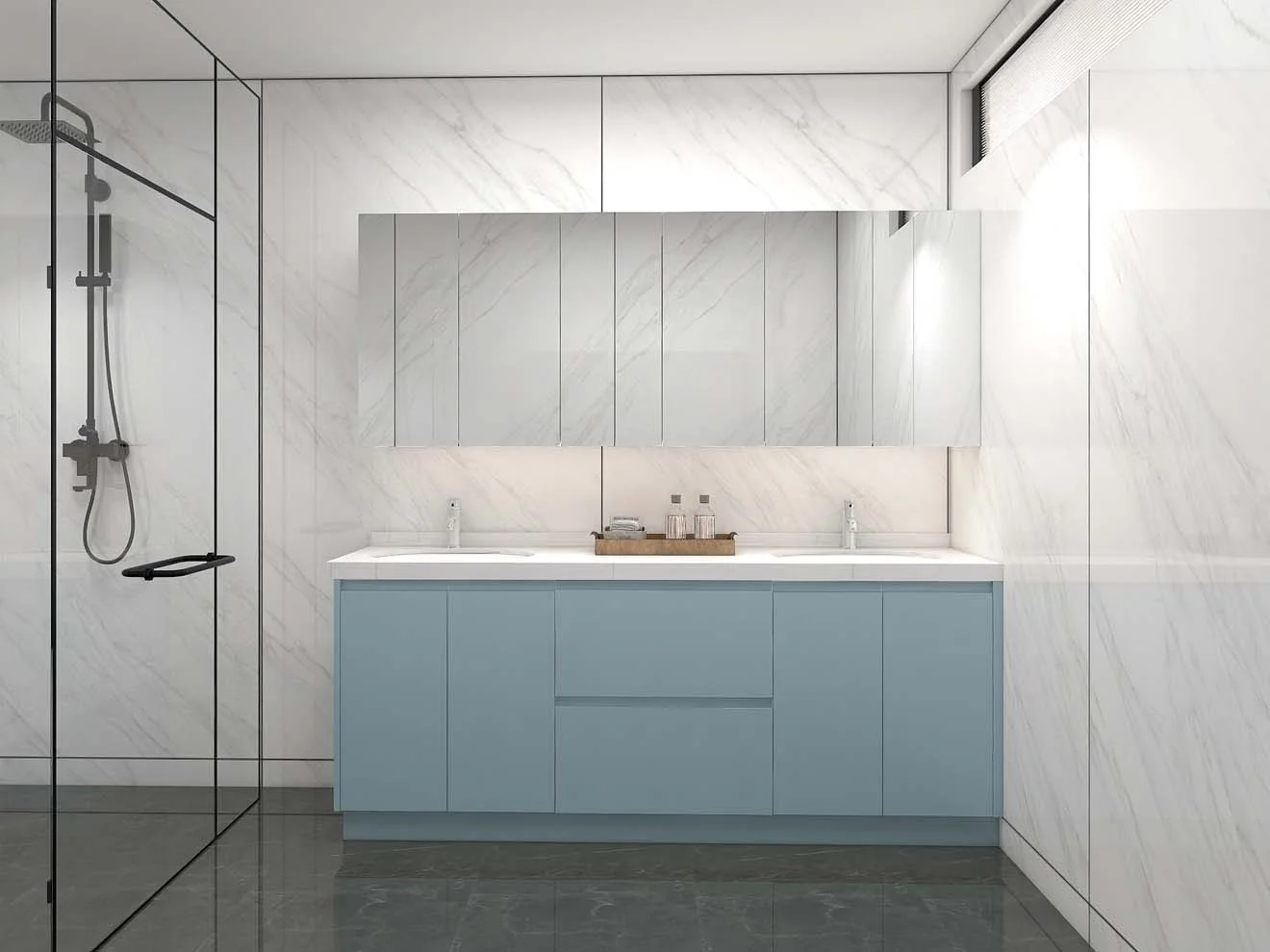 Los gabinetes tienen un acabado en un relajante tono azul, que complementa perfectamente las vetas blancas y grises de las paredes de mármol. El acabado brillante de los gabinetes realza su atractivo visual y facilita la limpieza, mientras que el mármol proporciona un fondo lujoso y duradero que eleva el diseño general.